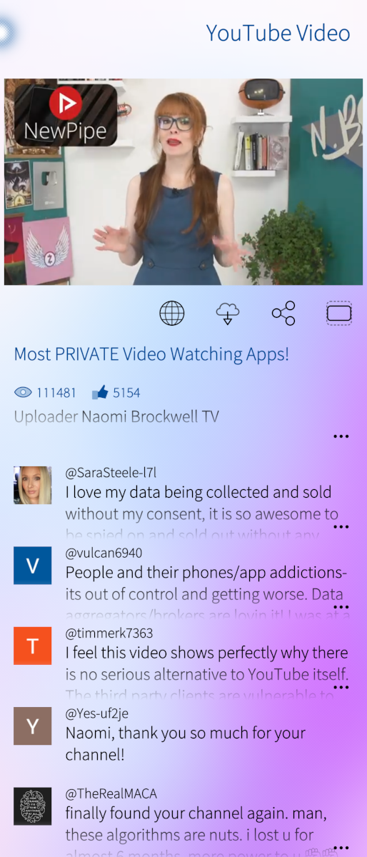 The app supports video and audio, streaming and downloading, search, filtering, channels, viewing playlists and viewing comments.