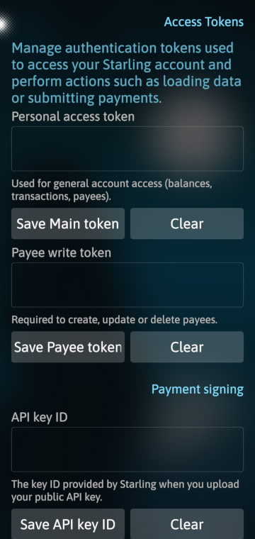 3.3. In harbour-starling app in Settings, add the first PAT (allInOne) into the first "Personal access token" field. (If you generated the second PAT (createPayeeOnly), add it into "Payee write token" field.