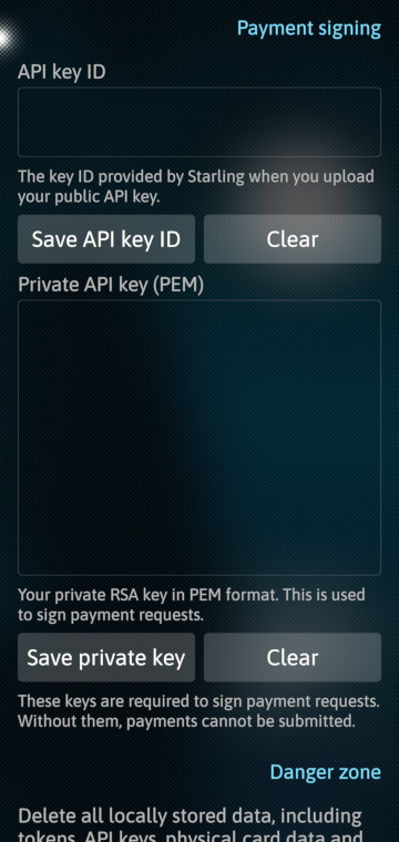 4. Making payment request requires API keys. This involves to generate your own RSA key pairs on your side (two pairs Main and Rotation) and entering on Developer..starlingbank.com to generate their one. Then, in harbour-starling app you'll need to store the API key that Starling gives you and your own main RSA key. here is how to do it: