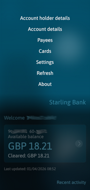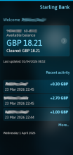 One minor glitch but fantastic work to get and display the rich Starling data. (UPCOMING DD transactions show as having been made in Recent Activity when they are not yet paid)