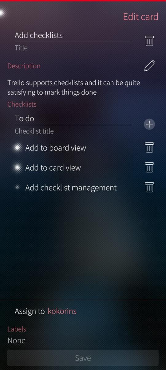 The app is meant to give Trello users a native experience on the phone: sign-in, browsing boards, opening boards and lists, viewing and editing cards, and simple formatted text in card descriptions. It includes an about screen and a cover view when the app is in the background. The interface is available in more than one language.