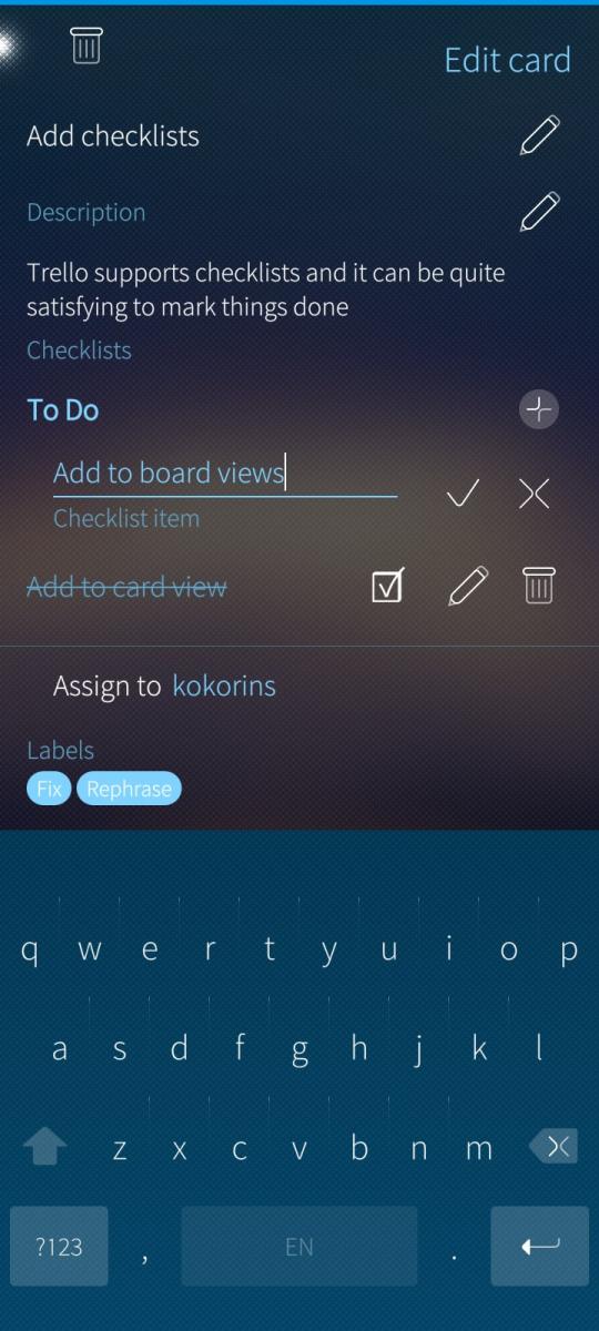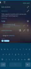 The app is meant to give Trello users a native experience on the phone: sign-in, browsing boards, opening boards and lists, viewing and editing cards, and simple formatted text in card descriptions. It includes an about screen and a cover view when the app is in the background. The interface is available in more than one language.