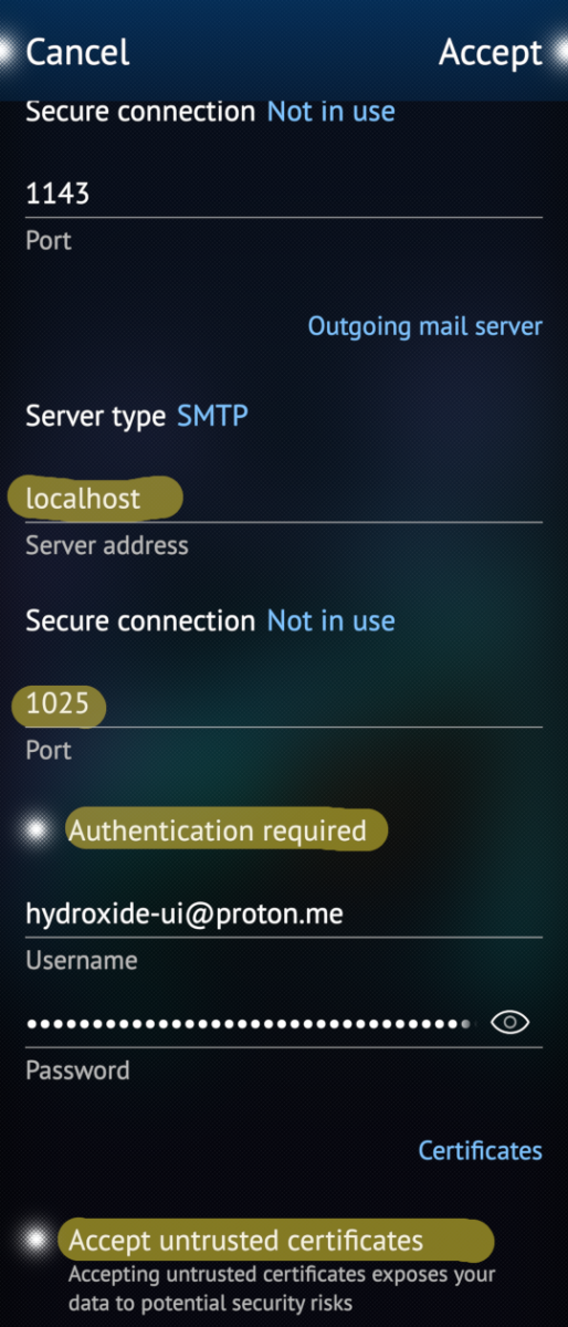 Once the bridge password is generated, you can add your Proton Mail account to Settings → Accounts → Other email using the local bridge.