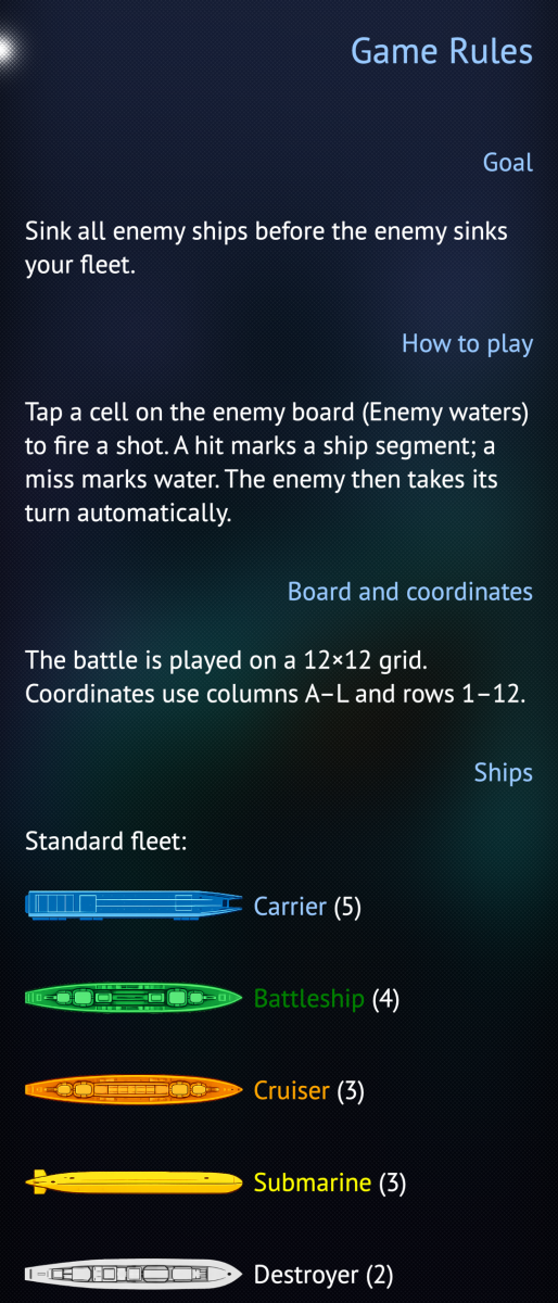 Arrange your fleet on a 12x12 grid, start the battle, and fire at enemy coordinates to find and sink every ship. The game shows clear hit/miss/sunk feedback, tracks battle time, number of shots, difficulty levels, game pace and lets you reveal the enemy fleet when the game ends.