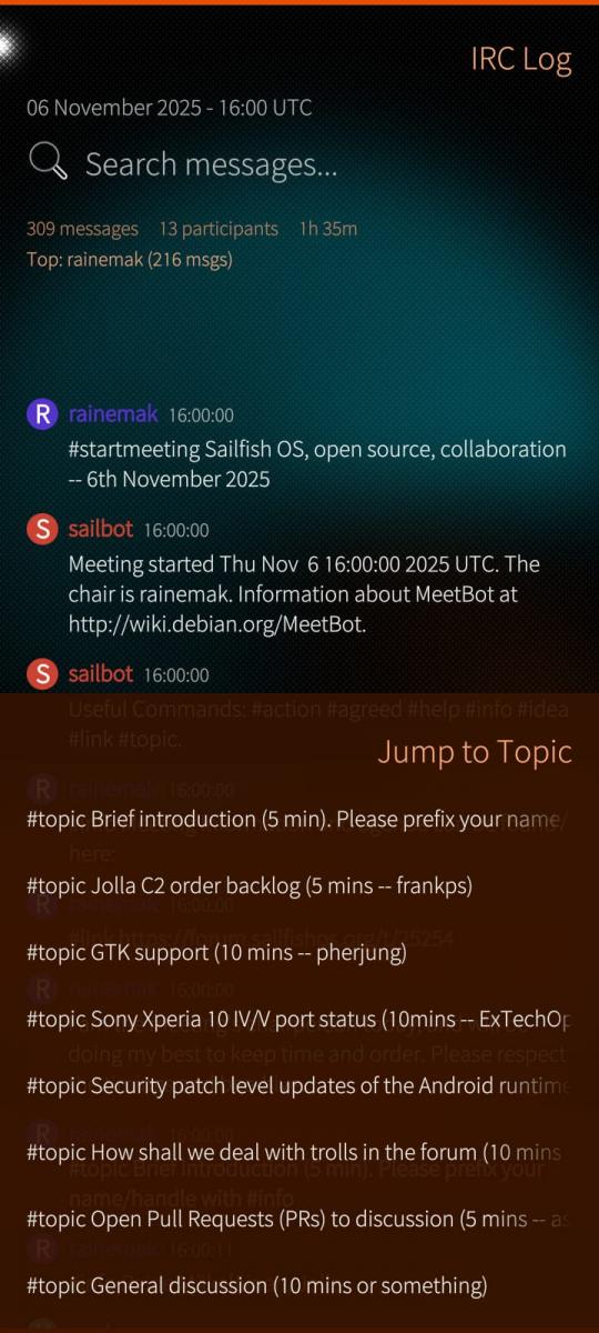 The app fetches meeting data directly from the official Sailfish OS IRC logs server, providing easy access to community discussions, decisions, and development updates.